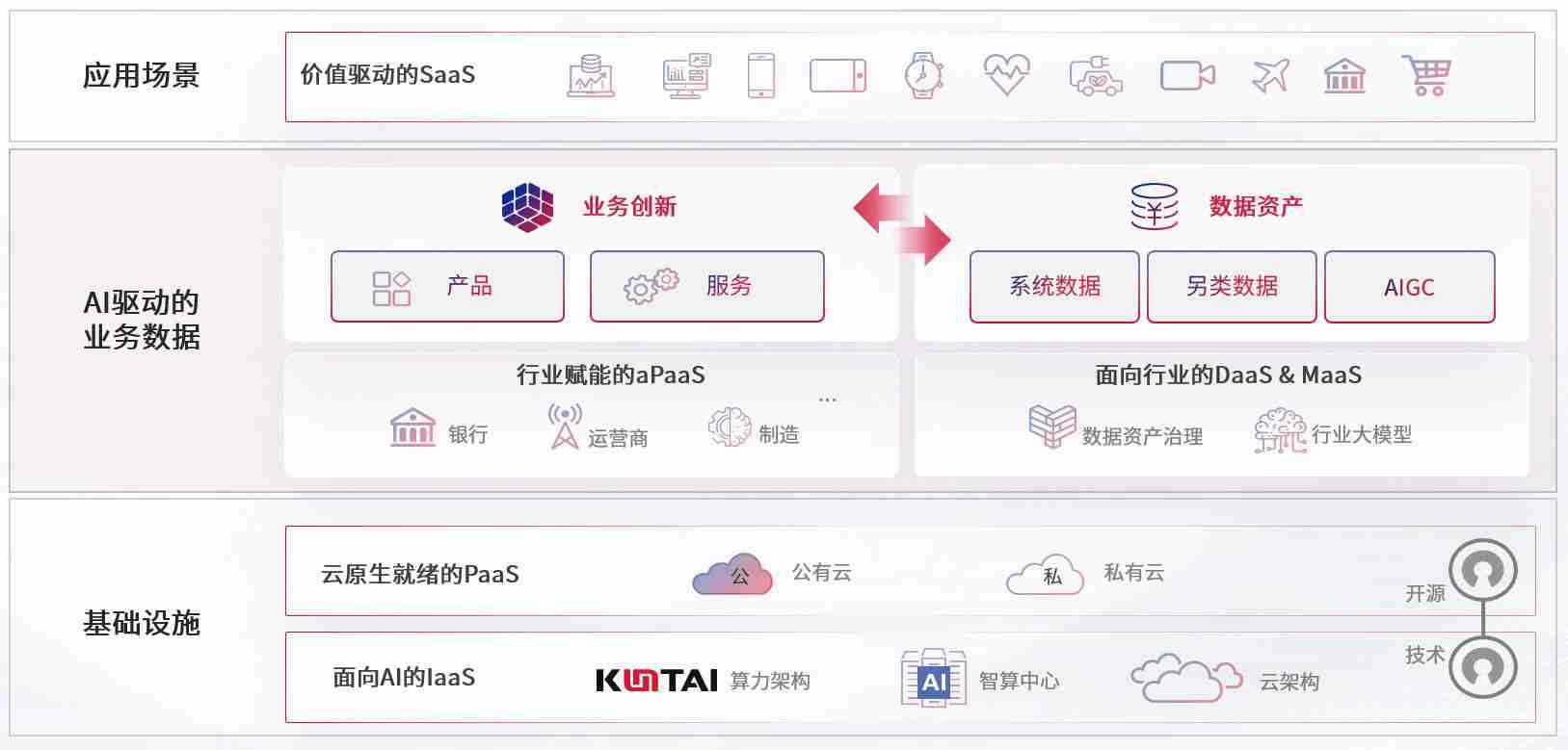 数字时代,,围绕企业数字化转型的关键要素,,,尊龙旗舰厅数码开创性的提出数云融合战略和技术体系框架,,着力在云原生、、、、数字原生、、AI原生和信创产业上架构产品和服务能力,,,,为处在不同数字化转型阶段的快消零售、、、汽车、、、、金融、、、医疗、、、、政企、、教育、、、、运营商等行业客户提供泛在的敏捷IT能力和融合的数据驱动能力,,,构建跨界融合创新的数字业务场景和新业务模式,,助力企业级客户建立面向未来的核心能力和竞争优势,,,,全面推动社会的数字化、、、智能化转型升级。。。